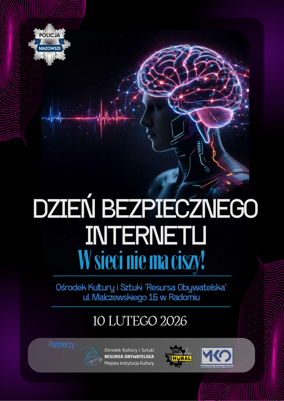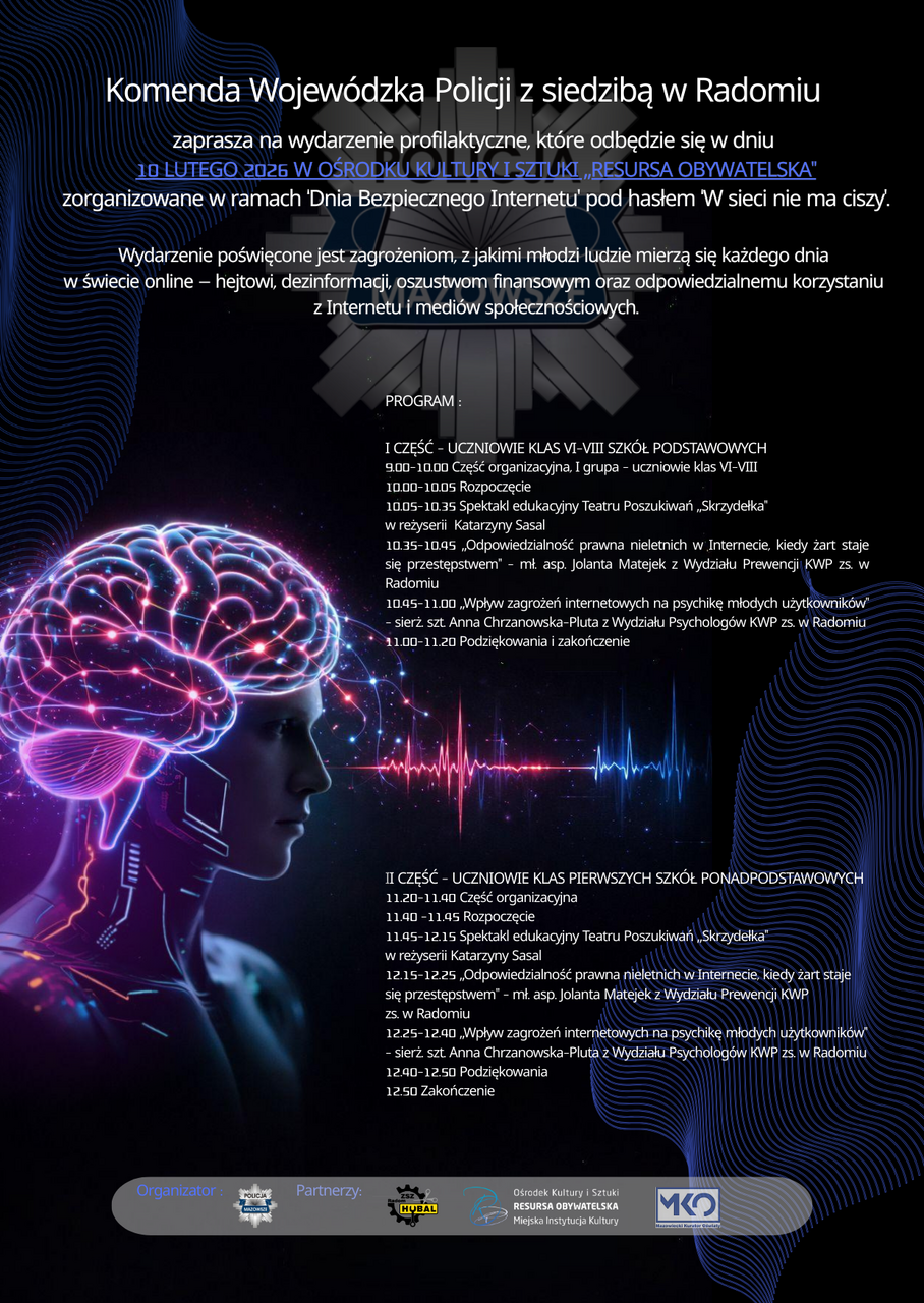 10 lutego 2026 roku w Ośrodku Kultury i Sztuki „Resursa Obywatelska” przy ul. Malczewskiego 16 w Radomiu, Komenda Wojewódzka Policji z siedzibą w Radomiu, we współpracy z partnerami, organizuje wydarzenie profilaktyczne pn. „W sieci nie ma ciszy!”, połączone z formą artystyczną, realizowane z okazji Dnia Bezpiecznego Internetu.
