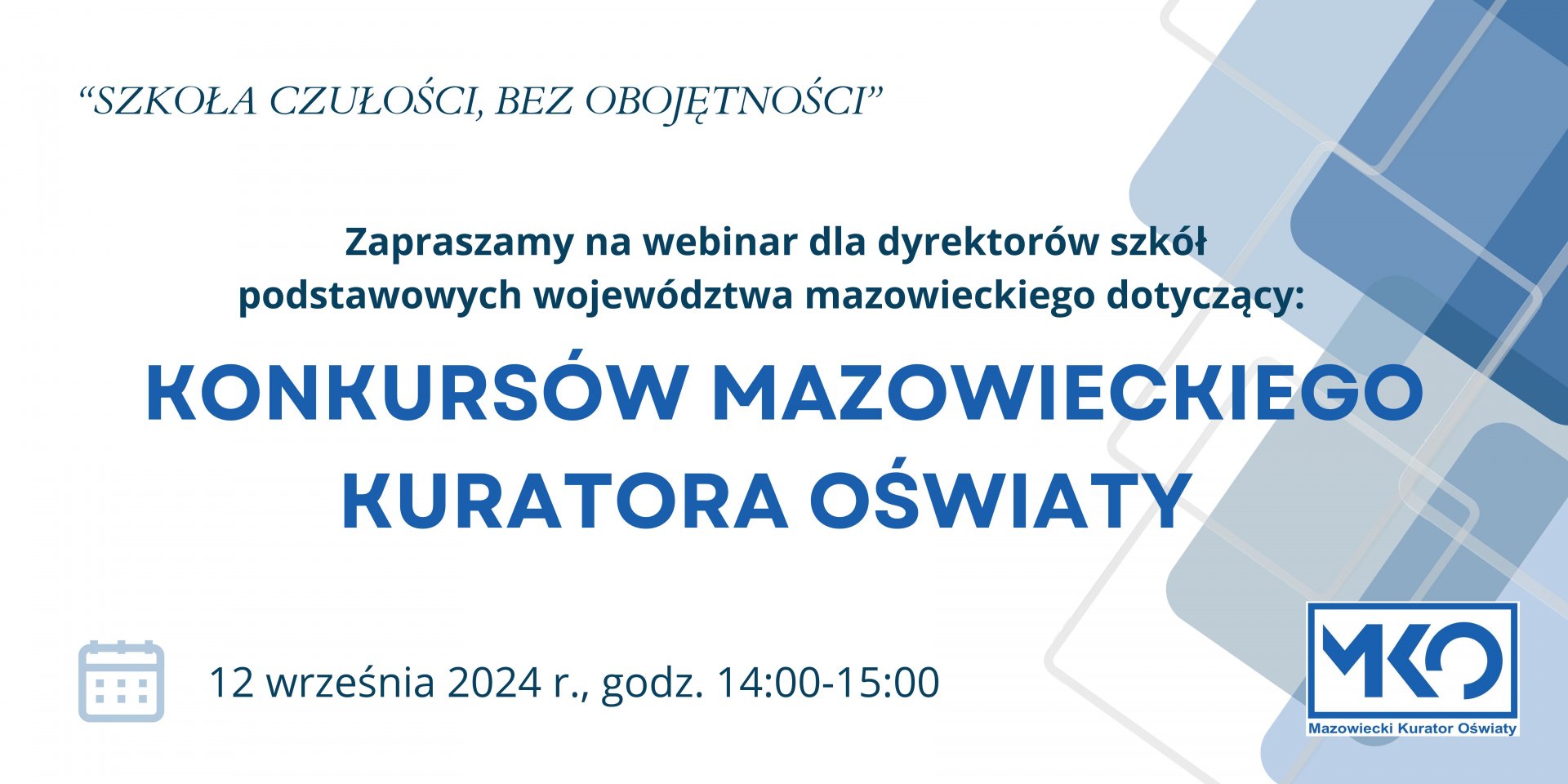 12 września br. o godzinie 14:00 Mazowiecka Kurator Oświaty zaprasza dyrektorów szkół podstawowych na webinar dotyczący konkursów przedmiotowych, tematycznych i interdyscyplinarnych organizowanych w nowym roku szkolnym.