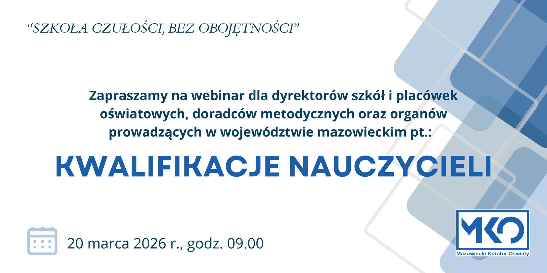 17.03.202620 marca 2026 r. o godzinie 9.00 zapraszamy dyrektorów szkół i placówek oświatowych, doradców metodycznych oraz organy prowadzące z województwa mazowieckiego na webinar pt.: „Kwalifikacje nauczycieli”.