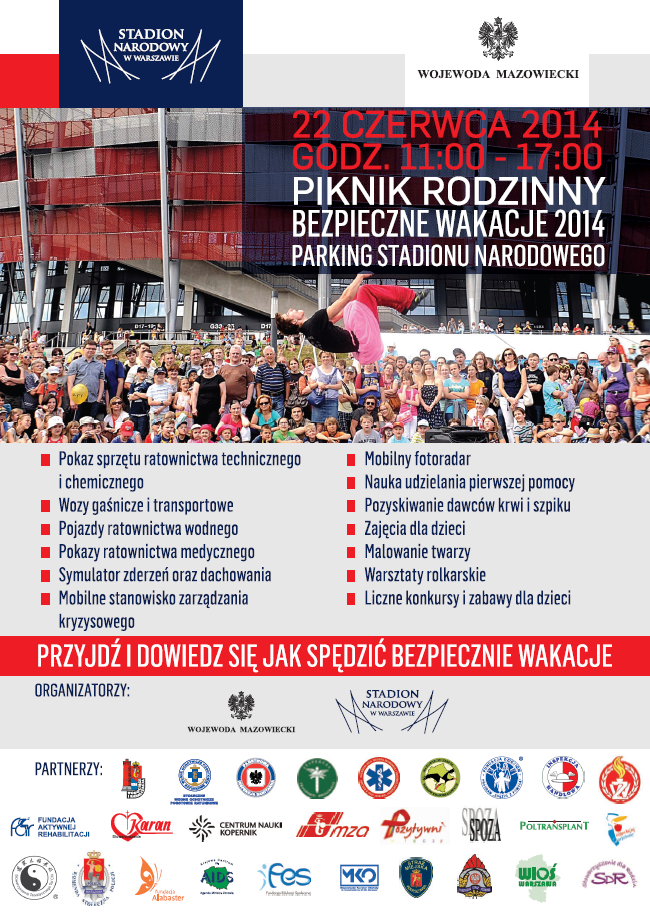 22 czerwca 2014 r. błonia Stadionu Narodowego zamienią się w kolorowe krainy – czerwoną, zieloną, żółtą oraz błękitną. Od godz. 11 do 17 najmłodsi będą mieli okazję do nauki bezpieczeństwa poprzez zabawę. Na dzieci będą czekać m.in. przejażdżka strażackim quadem, kino edukacyjne i symulatory jazdy. Przewidziano warsztaty edukacyjne o bezpieczeństwie nad wodą, w ruchu drogowym czy pierwszej pomocy medycznej. Rodzice mogą skorzystać m.in. z porad medycznych i prawnych. Pracownicy Kuratorium Oświaty w Warszawie będą udzielać merytorycznych i praktycznych informacji zainteresowanym rodzicom na temat wymagań jakie powinien spełniać organizator wypoczynku dla dzieci i młodzieży oraz czy organizator dokonał zgłoszenia wypoczynku. Atrakcje przygotowało ponad 20 instytucji w ramach rządowego programu Razem Bezpieczniej. Wstęp jest bezpłatny. Organizatorami imprezy są Mazowiecki Urząd Wojewódzki oraz operator Stadionu Narodowego - PL.2012.